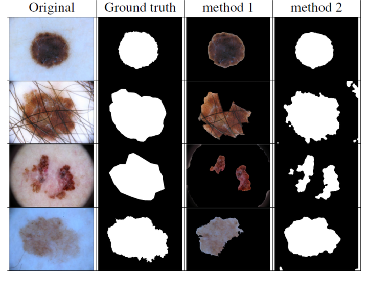 Results by both methods. method 1 uses watershed, while method 2 uses mean shift.Lesion segmentation from the surrounding skin is the first task for developing automatic Computer-Aided Diagnosis of skin cancer. Variant features of lesion like uneven distribution of color, irregular shape, border and texture make this task challenging. The contribution of this paper is to present and compare two different approaches to skin lesion segmentation. The first approach uses watershed, while the second approach uses mean-shift. Pre-processing steps were performed in both approaches for removing hair and dark borders of microscopic images. The Evaluation of the proposed approaches was performed using Jaccard Index (Intersection over Union or IoU). An additional contribution of this paper is to present pipelines for performing pre-processing and segmentation applying existing segmentation and morphological algorithms which led to promising results. On average, the first approach showed better performance than the second one with average Jaccard Index over 200 ISIC-2017 challenge images are 89.16 % and 76.94 % respectively.